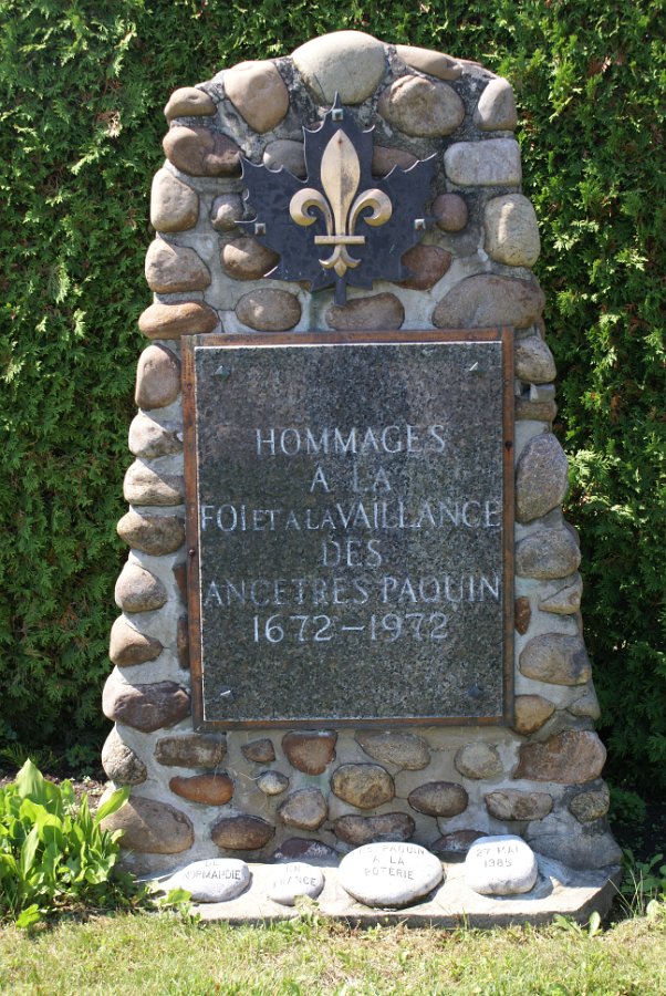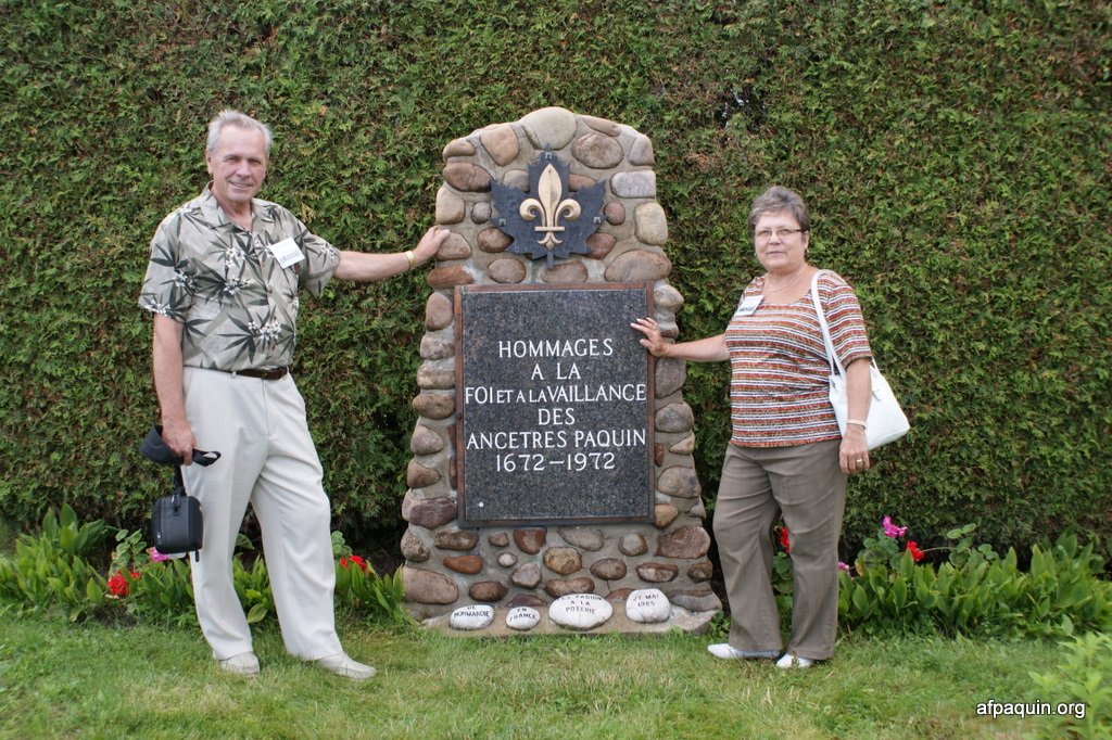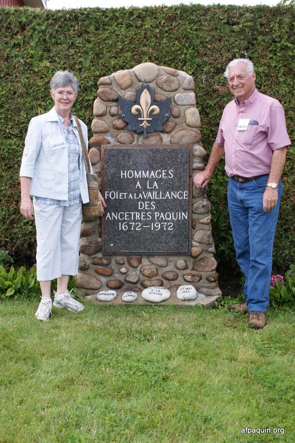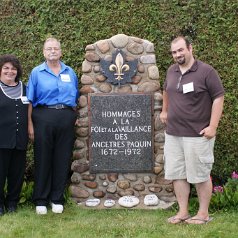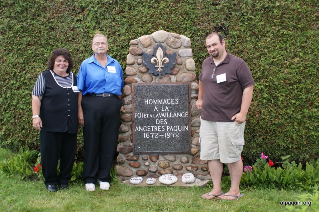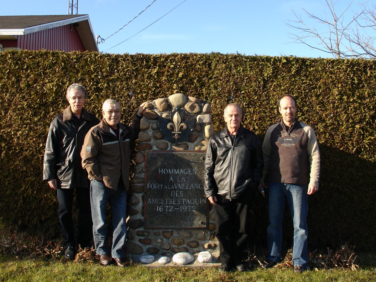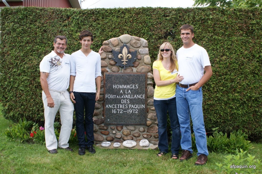 Hommages à nos ancêtresLe monument en 2007 Bastien Paquin / Maurice Paquin / Rémi Paquin Réjean Paquin et son fils Jean-Marie Paquin et Claude Paquin Nicole et Denise Paquin Alice Paquin / Clayton Carlisle en 2009 Jean-Paul et Jean-Marie Paquin Roland Pequin / Cody / Danielle / Bradley Jean-Paul Paquin / Ghislaine Charette Intégration à la base du monument des pierres reçu de FranceRéparation du monument