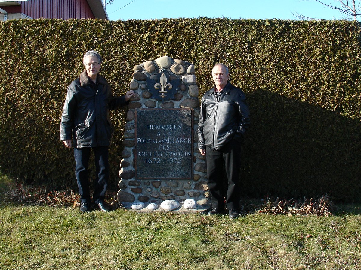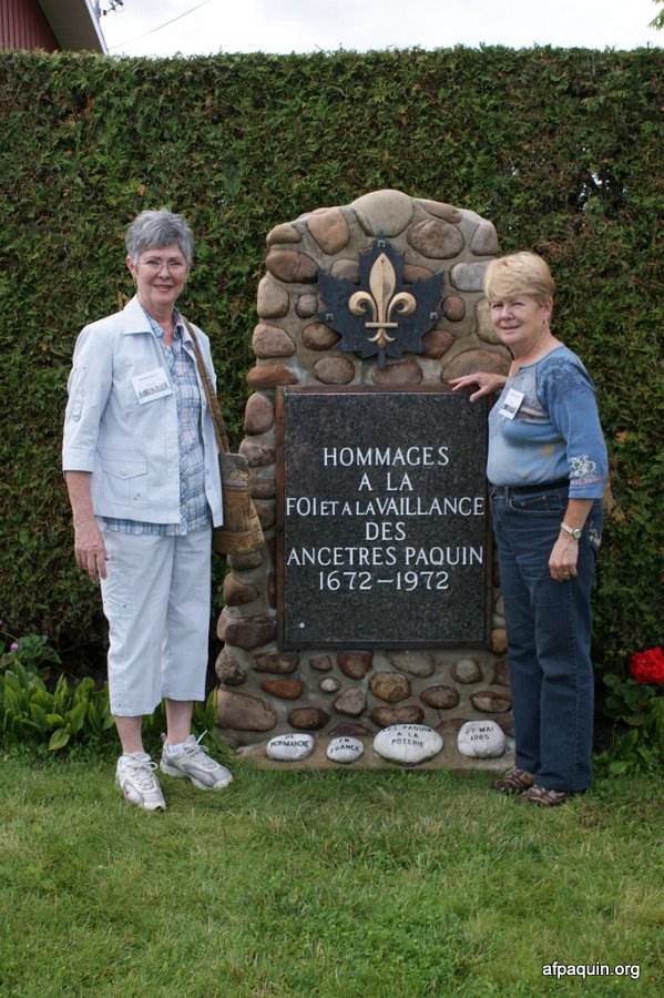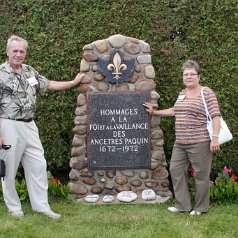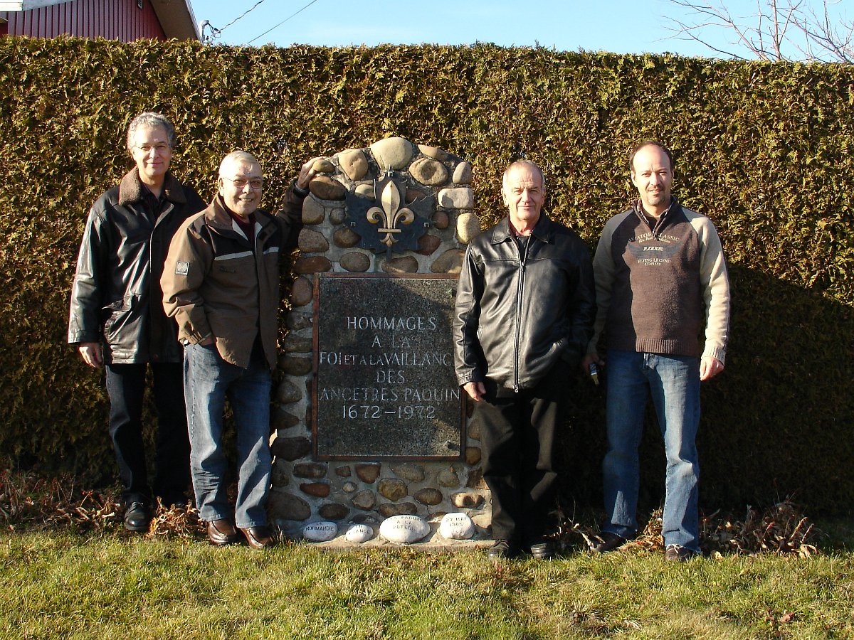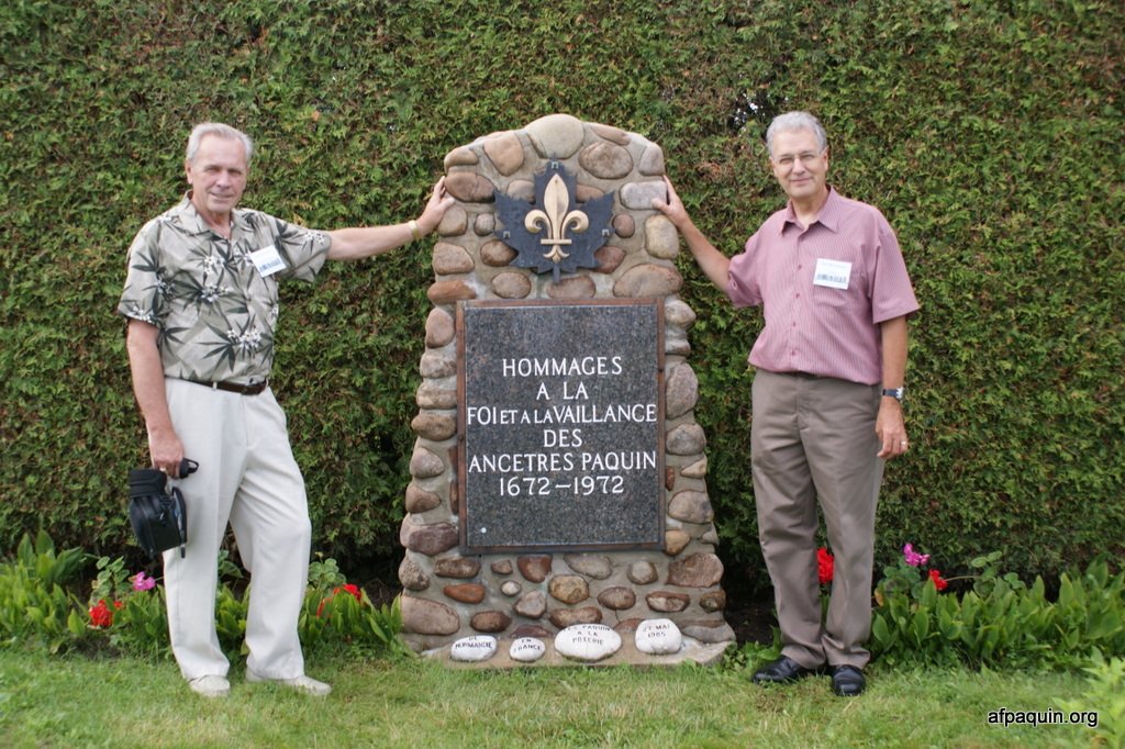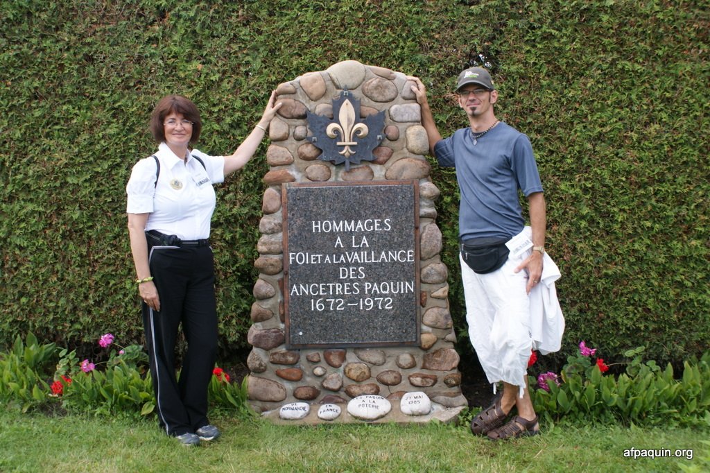 Hommages à nos ancêtresLe monument en 2007 Bastien Paquin / Maurice Paquin / Rémi Paquin Réjean Paquin et son fils Jean-Marie Paquin et Claude Paquin Nicole et Denise Paquin Alice Paquin / Clayton Carlisle en 2009 Jean-Paul et Jean-Marie Paquin Roland Pequin / Cody / Danielle / Bradley Jean-Paul Paquin / Ghislaine Charette Intégration à la base du monument des pierres reçu de FranceRéparation du monument